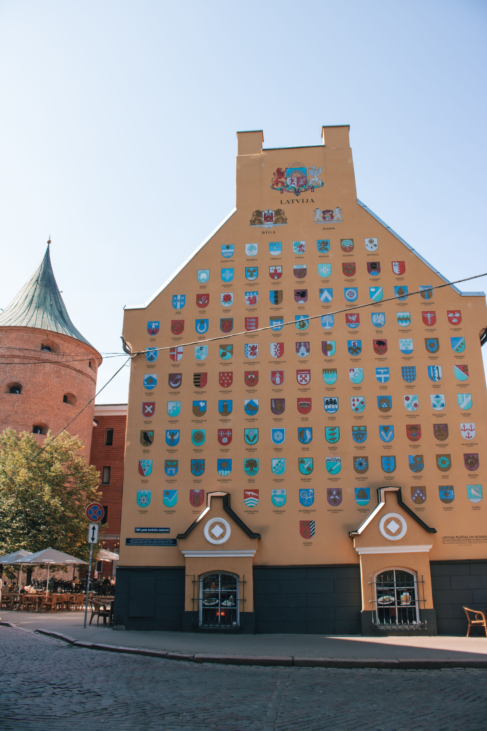 The Jacob’s Barracks building on Tornu Street in Riga’s Old Town features coats of arms representing Latvian parishes. This yellow building is adorned with various symbols on its facade. Located in the historical center of Riga, it is part of the UNESCO World Heritage Site.