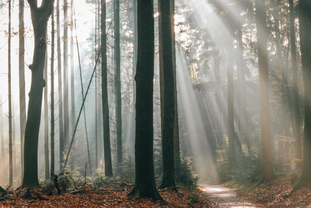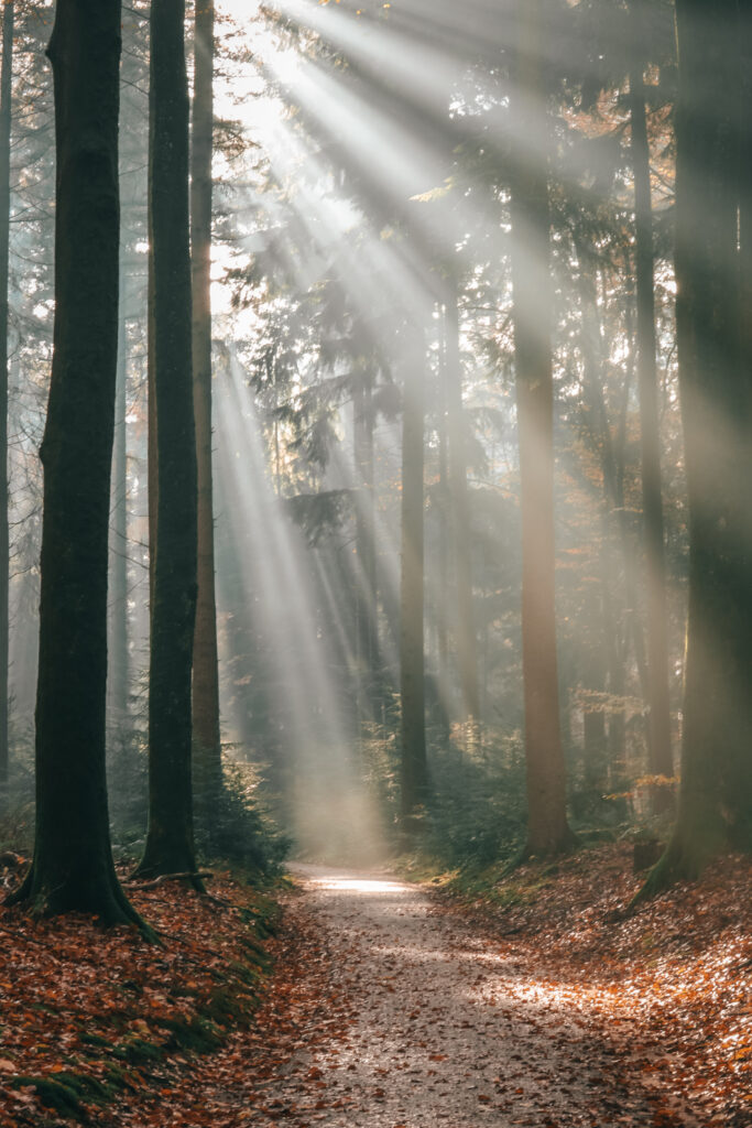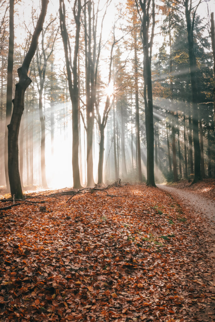 The ultimate dreamy fall forest photos usually contain mist and/or sunshine, and these two combined create magical sunbeams. Therefore capturing sunbeams requires the perfect mix of both. Without the right weather, getting that magical effect is nearly impossible. Check the weather forecast thoroughly, even the night before. Look for mist predictions and a bit of sunshine. A partly cloudy day works too, as long as the sun occasionally breaks through the clouds.
